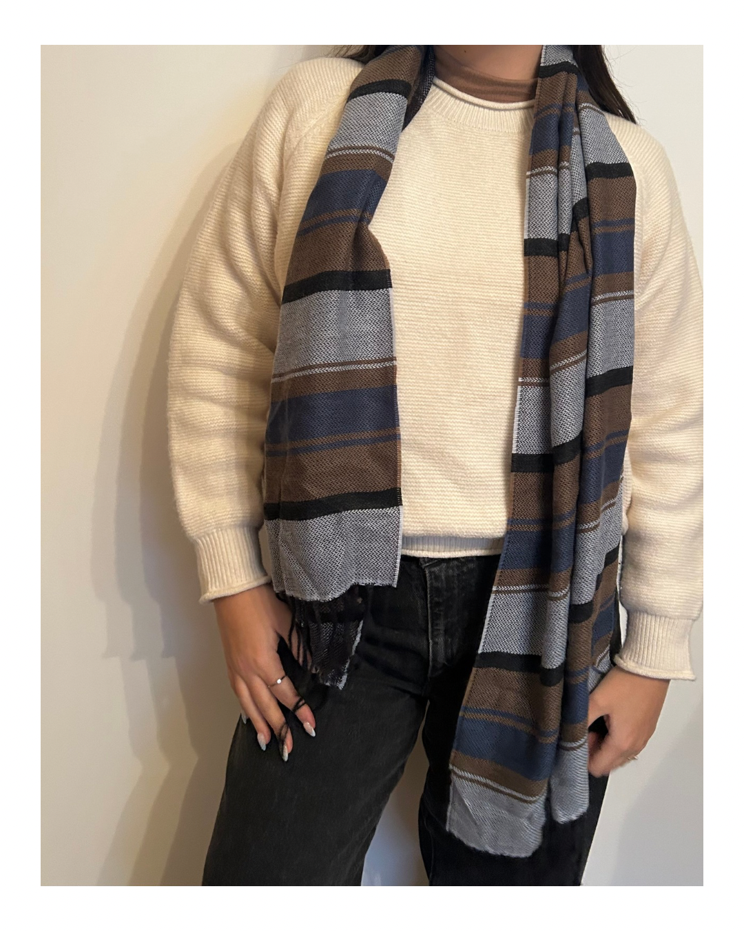 Bufanda combinada en marrón, negro, gris y azul marino.