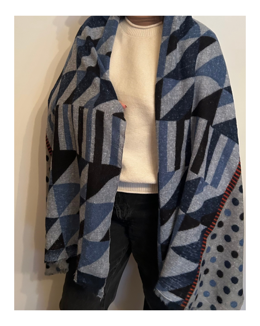 Bufandón combinado. En tonos de grises y azules.