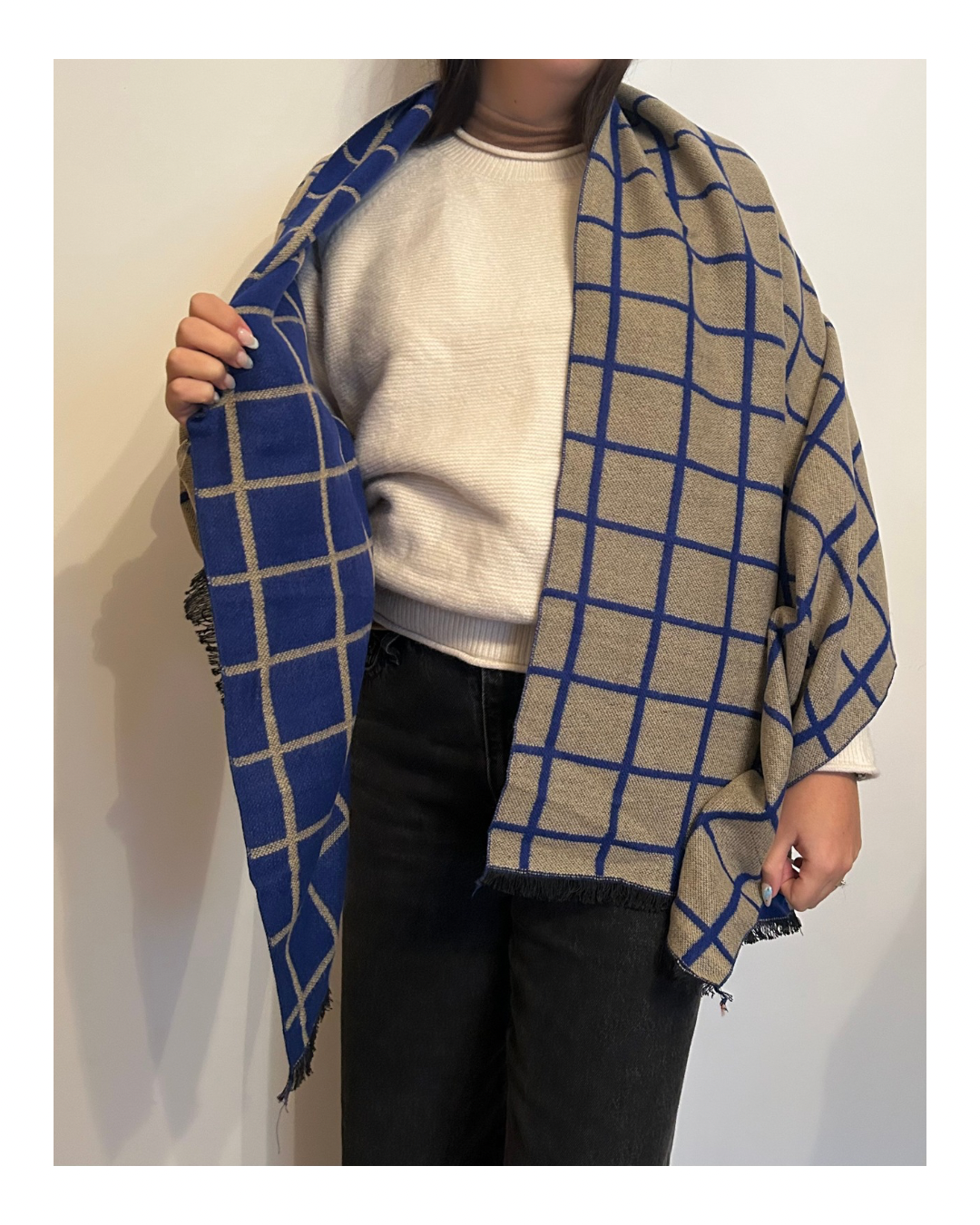 Bufandón combinado En beige y azul. Reversible.
