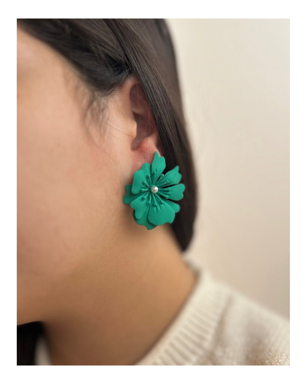 Caravana color verde en forma de flor, tamaño medio, con perla en el centro
