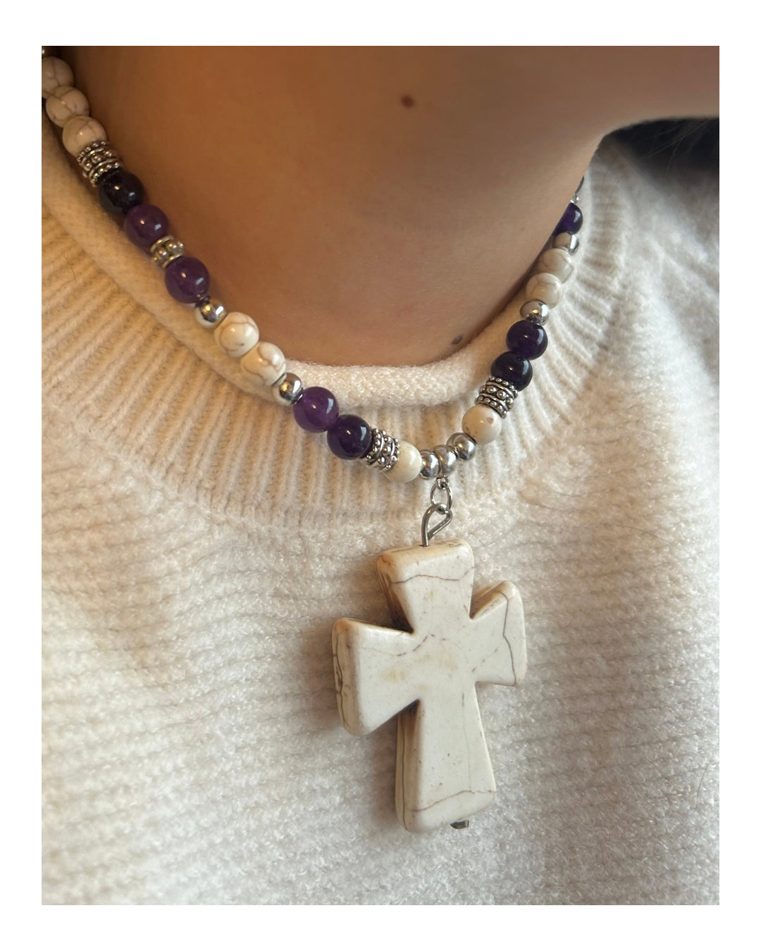 Collar de pidearse naturales en combinación de piedras reconstituidas, piedras amatistas y algo de metal. Dije en cruz de piedras reconstituidas.