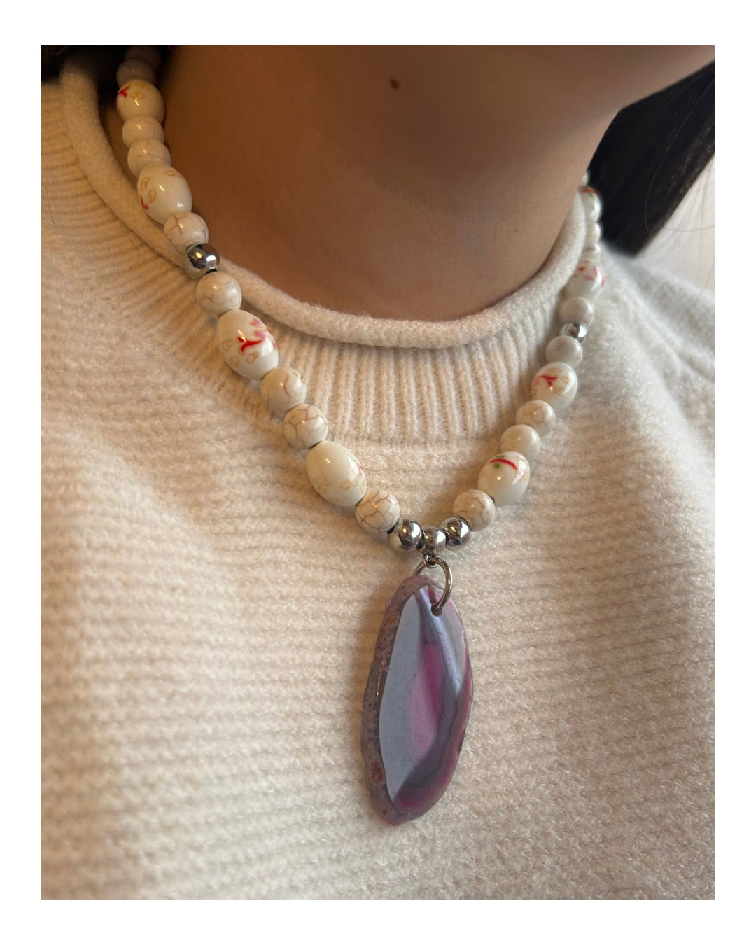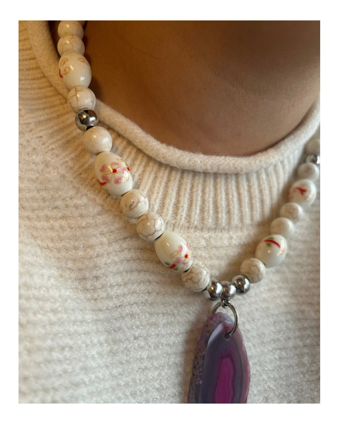 Colla en combinación de piedras reconstituidas, cerámicas con diseño floral y metal, con dije en ágata en tonos rosado, violeta y destellos más oscuros.