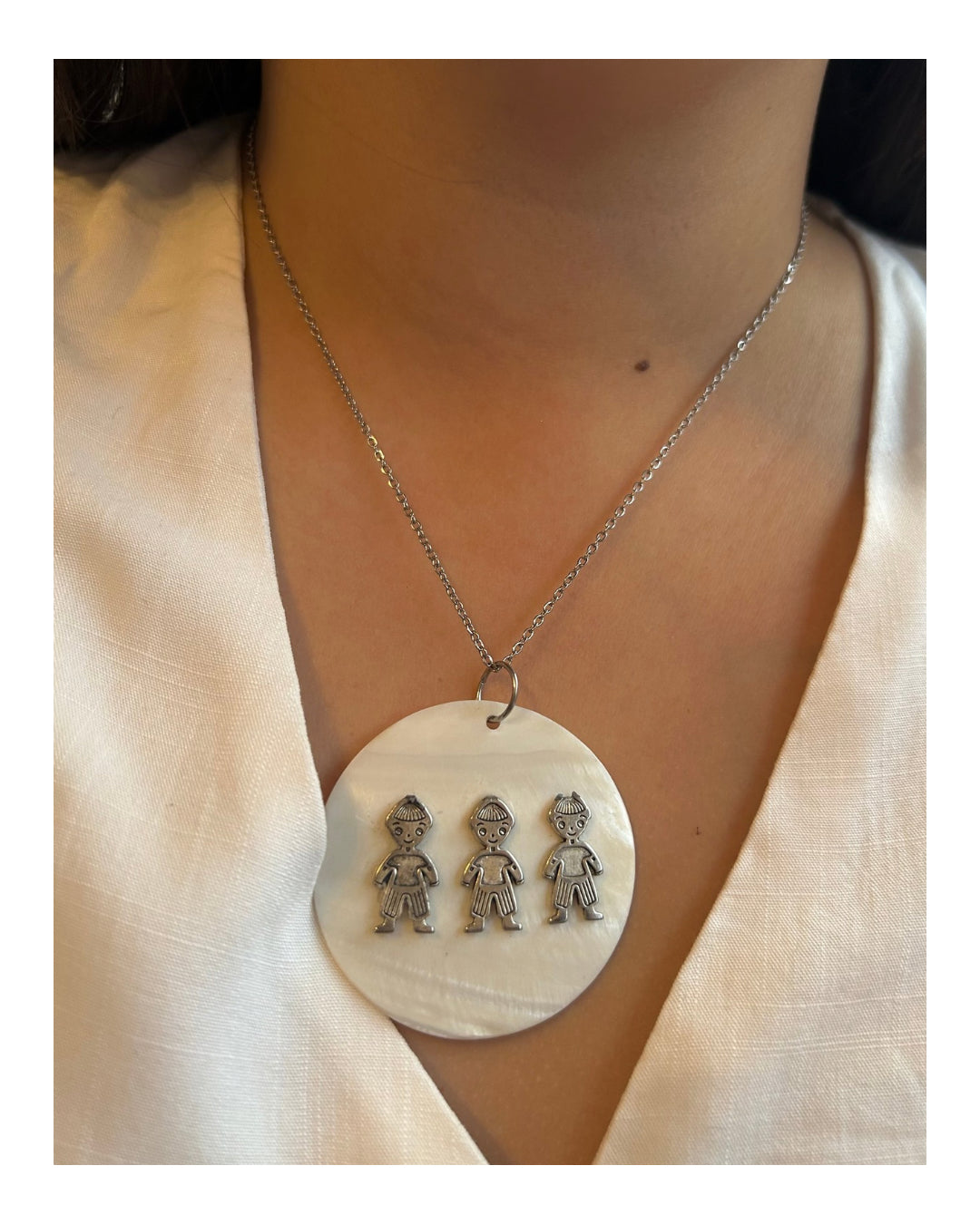 Cadena de acero fina, con dije en nácar natural y aplique de niños.