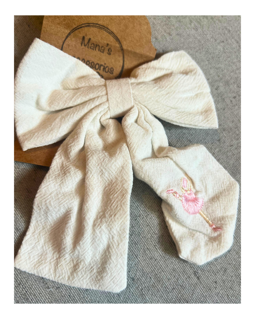 Moña de tela bordada con un diseño de bailarina, su base es en pinza. Única, blanca.