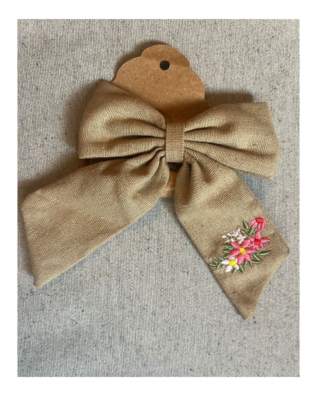 Moña de tela bordada con base en pinza. Color marrón claro