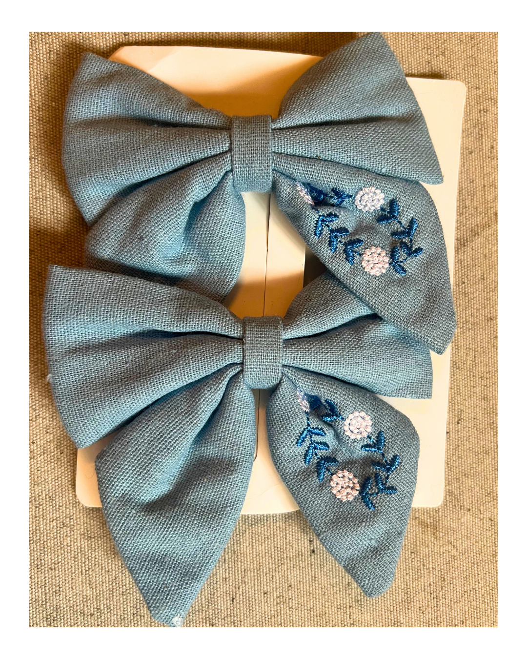 Moñas de tela bordadas con base en pinza. Color azul/celeste