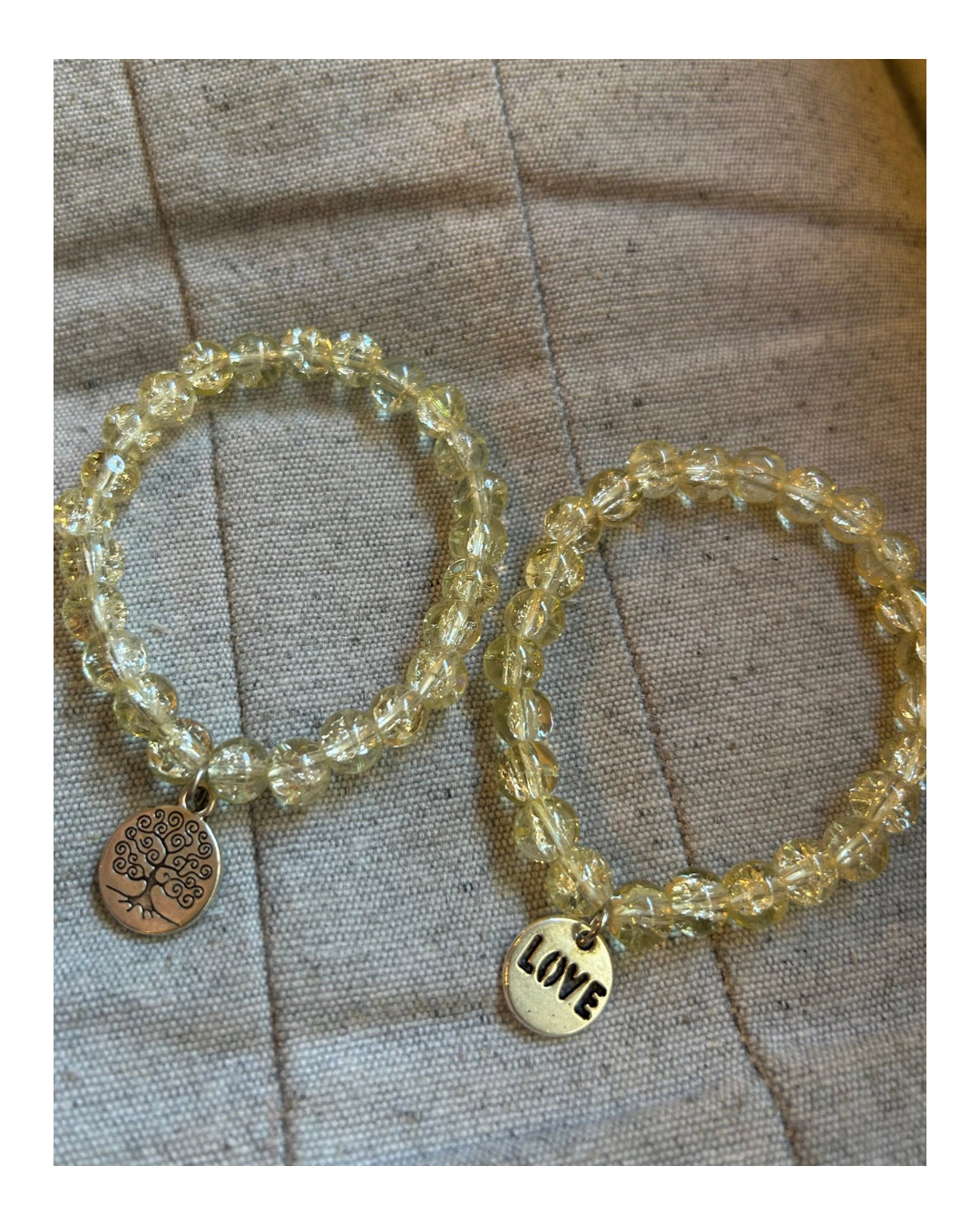Pulseras de acrílico transparente, con leve entonación de amarillo. Con dije en metal